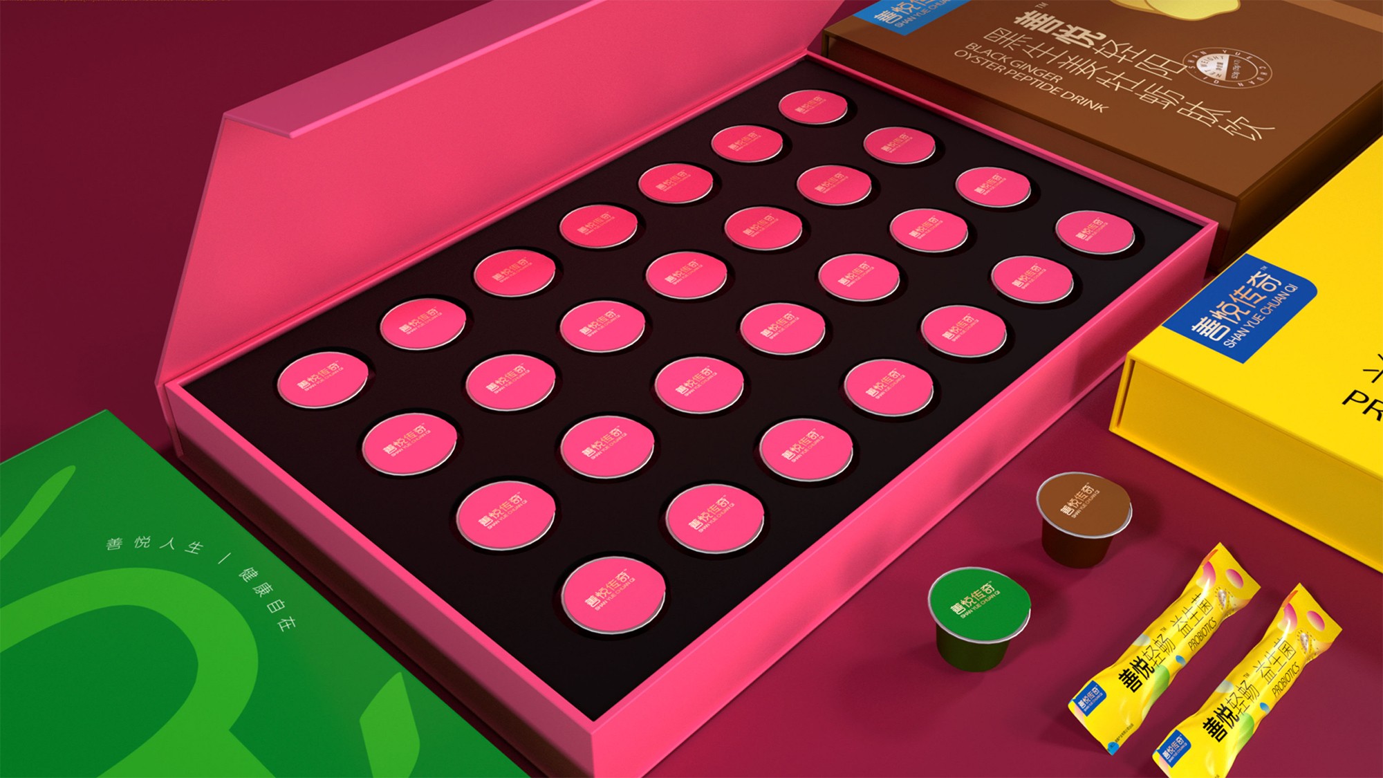 2020年年初,鼎峰收善悦品牌公司所托,对“善悦”品牌进行logo设计及4款系列产品策划包装开发设计,对于滋补品健康产业产品的品牌规划和产品包装设计是鼎峰品牌设计的强项,通过前期项目分析,根据产品销售场景、产品受众及产品的核心卖点出发,通过市场竞品及环境分析,最后将以年轻化设计方向为品牌设计调性和产品输出表现方式。